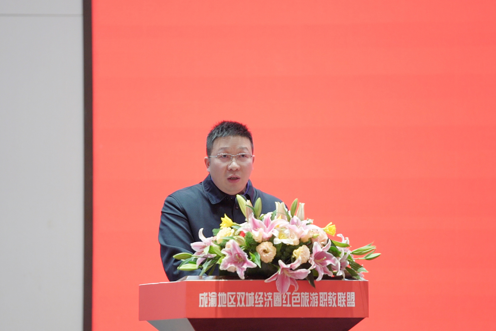 学校校长助理李晓强同志就成立“成渝地区双城经济圈红色旅游职教联盟”的背景从政策背景、资源背景、文化背景和时代背景和筹建背景等五个方面进行说明。