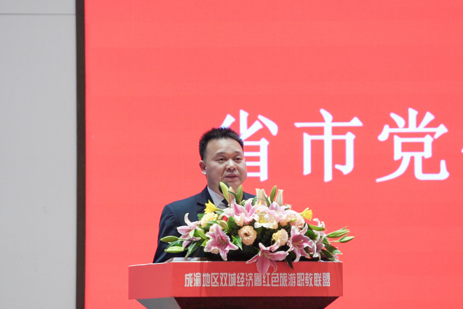 四川省教育厅二级巡视员杨亚培、重庆市教委高教处处长蒋云芳、四川省文化和旅游厅资源开发处一级调研员田茂成出席会议并讲话,广安市政府副秘书长、地志办主任徐诚在会上致辞。重庆旅游职业学院党委书记熊斌,学校党委书记王建平,党委副书记、校长王义全,四川省教育厅职业教育处副处长陈明政,重庆市教育国际交流协会会长胡斌等出席大会。