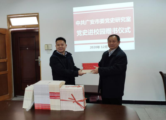 12月3日,为深入开展党史“七进+”党史进校园活动,市委党史研究室一级调研员侯立新一行赴学校为正在筹建的希贤班读书社赠送党史书籍,赠送《中国共产党广安历史》第一卷、第二卷,《中国共产党广安历史大事记(1993-2011》《广安在坚守初心和使命中砥砺前行》《邓小平与当代中国》及《邓小平研究》(期刊)等书籍60余本。
