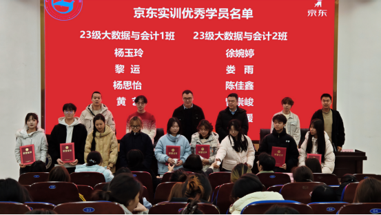 学院党总支书记吴小平宣读了2025年京东延保实训优秀学员名单,并与院长、企业导师一同为获奖学生颁发荣誉证书。优秀学员代表杨玉玲、徐婉婷分别发言,分享了实训期间的收获与感悟。