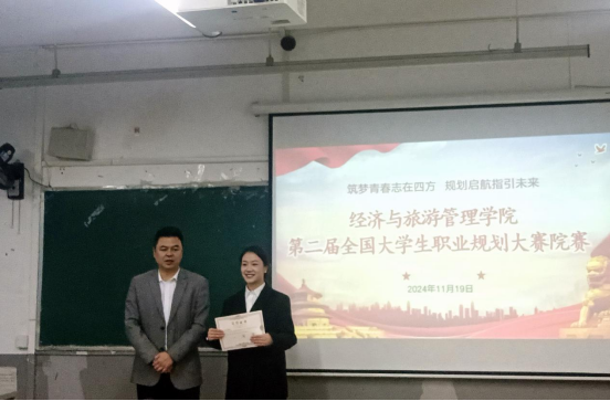 比赛现场气氛热烈,选手们展示自己精心制作的PPT。他们通过生动的演讲,以自信的姿态和清晰的思路,展示了各自对未来职业的规划与梦想。评委们根据参赛者的职业规划、表达能力、逻辑思维和现场表现等方面进行了综合评分。在激烈的角逐中,2024级旅游管理1班王雨霜、2022级物流管理1班蒋静分别在成长赛道和就业赛道脱颖而出,获得本次比赛一等奖。最后,学院领导和老师们为获奖学生现场颁奖。